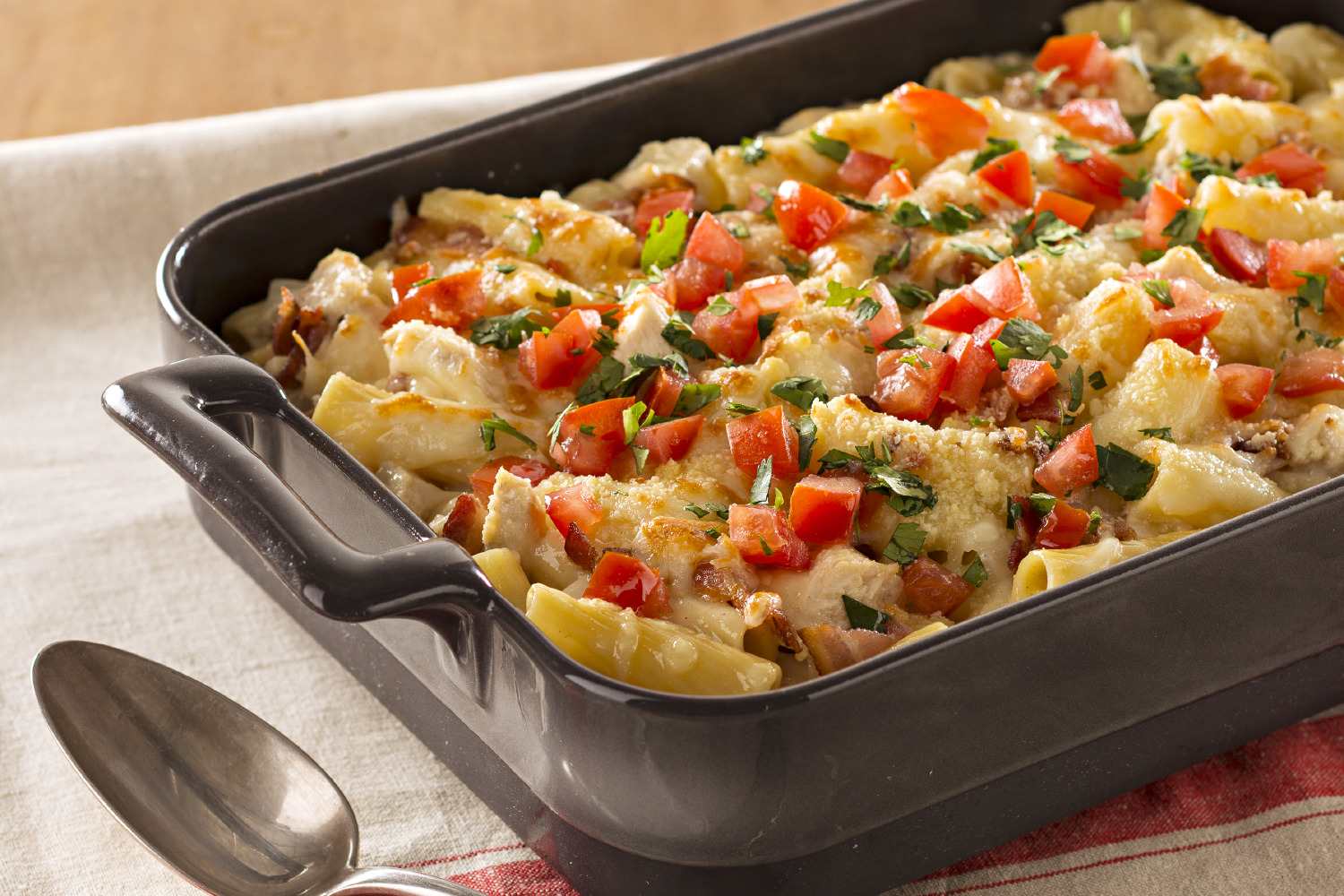 Please the family with our Monterey Chicken Pasta Bake! This tasty chicken pasta bake with bacon and rigatoni is ready for the oven in just 20 minutes.