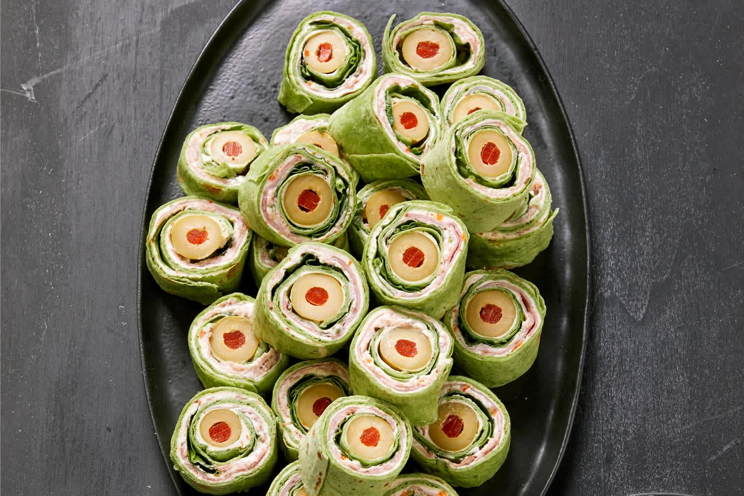 Place 2 ham slices on center of each topped tortilla, overlapping edges of slices as necessary to completely cover center of tortilla. Spread chopped ham mixture onto ham slices; cover with spinach. Roll up tightly, starting at olive-topped sides. Wrap individually with plastic wrap.