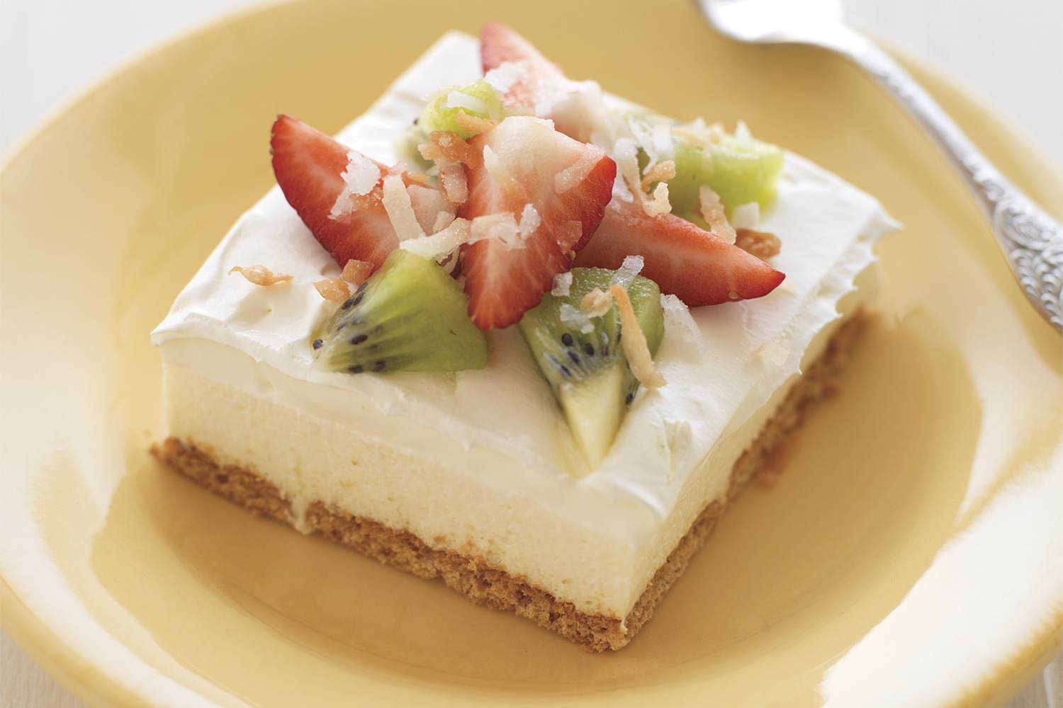 Fresh fruit and toasted coconut top this graham-cracker-pudding dessert to add a new twist to the iconic ice box cake.
