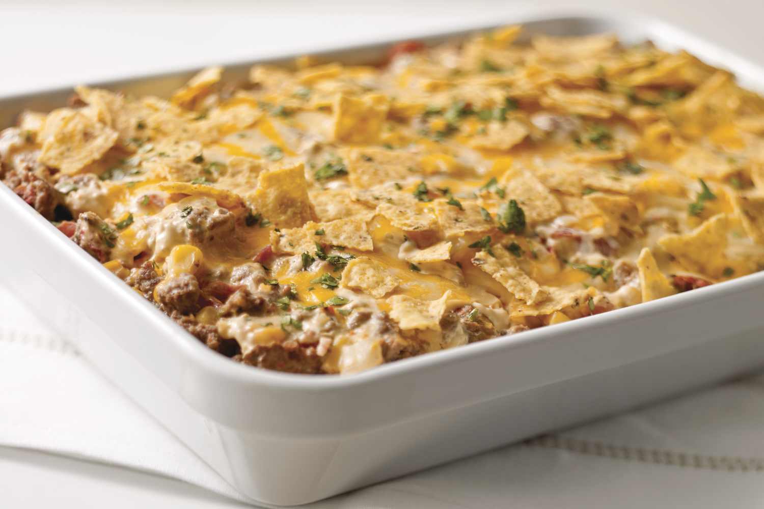 Bake 30 min. or until heated through. Top with crushed chips and cilantro.