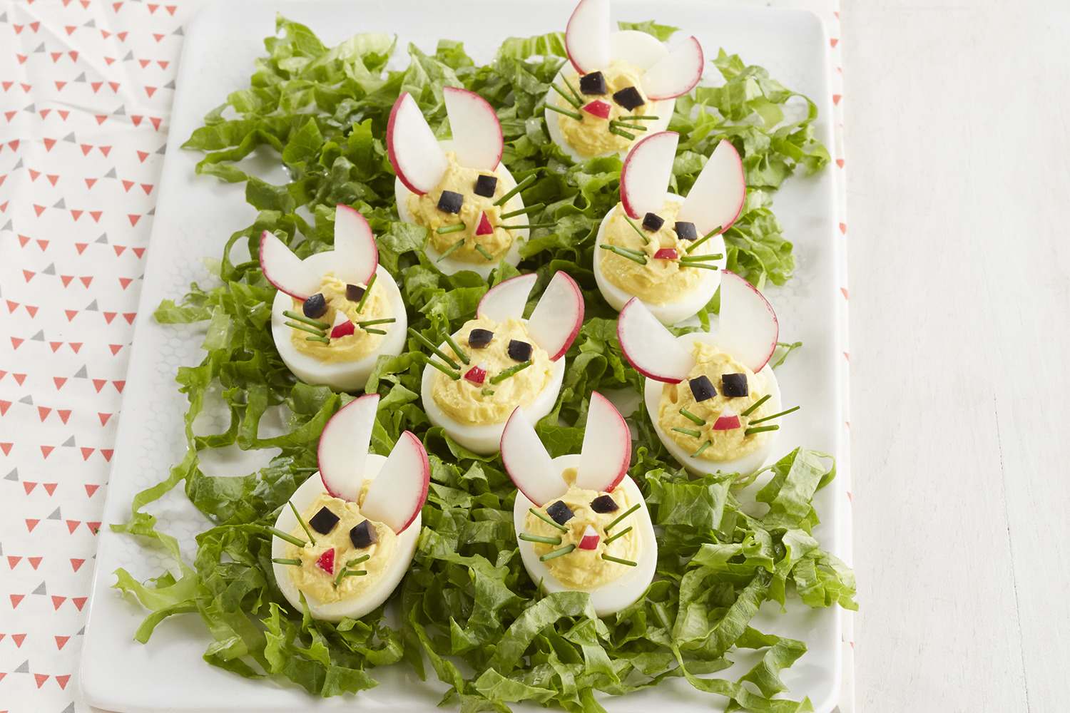 Cut both ends off each radish; cut into 24 small pieces for the bunnies' noses. Cut each of the trimmed radishes into 6 lengthwise slices, then cut each slice crosswise in half for the bunnies' ears.