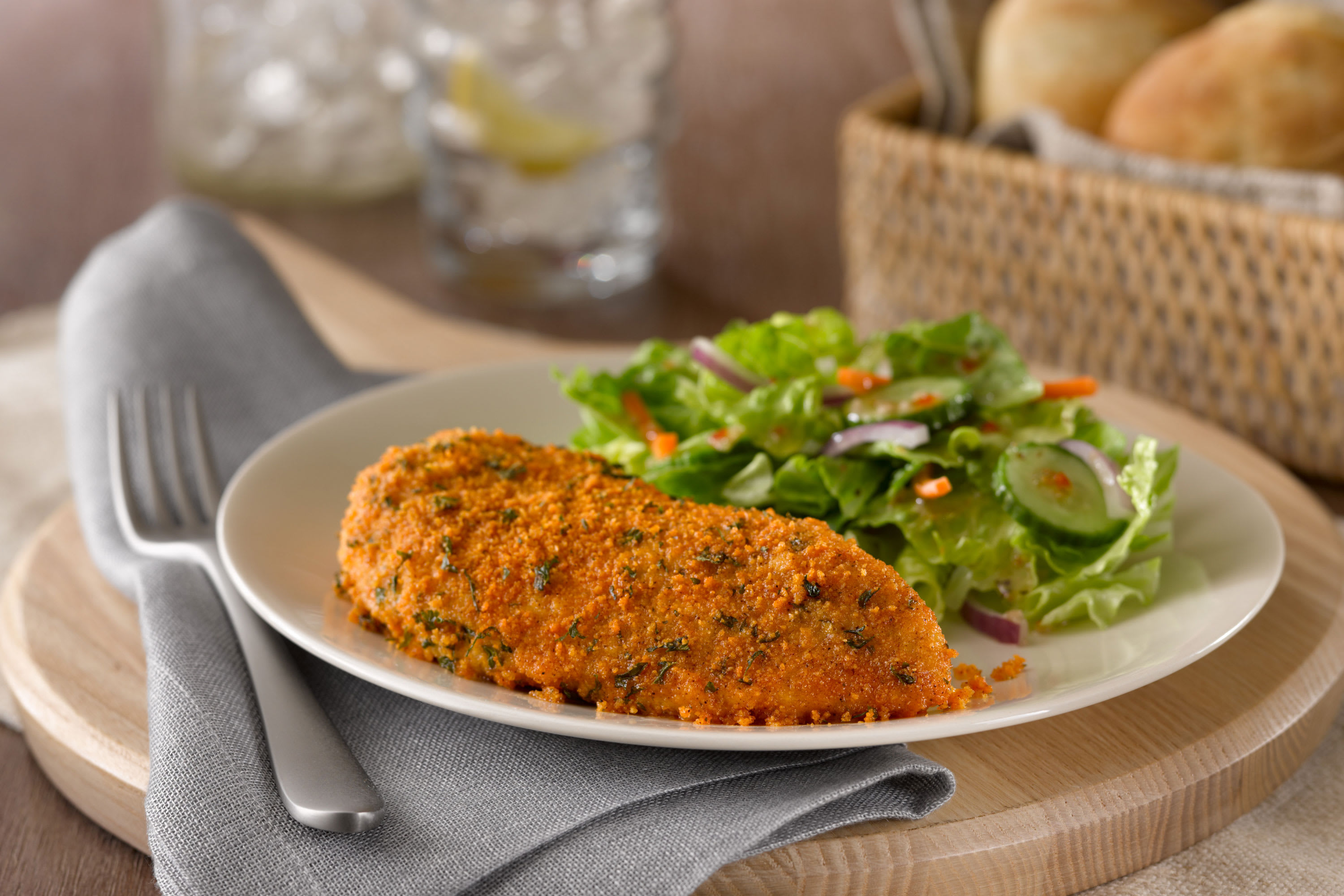 Mix coating mix and rosemary in shallow dish.