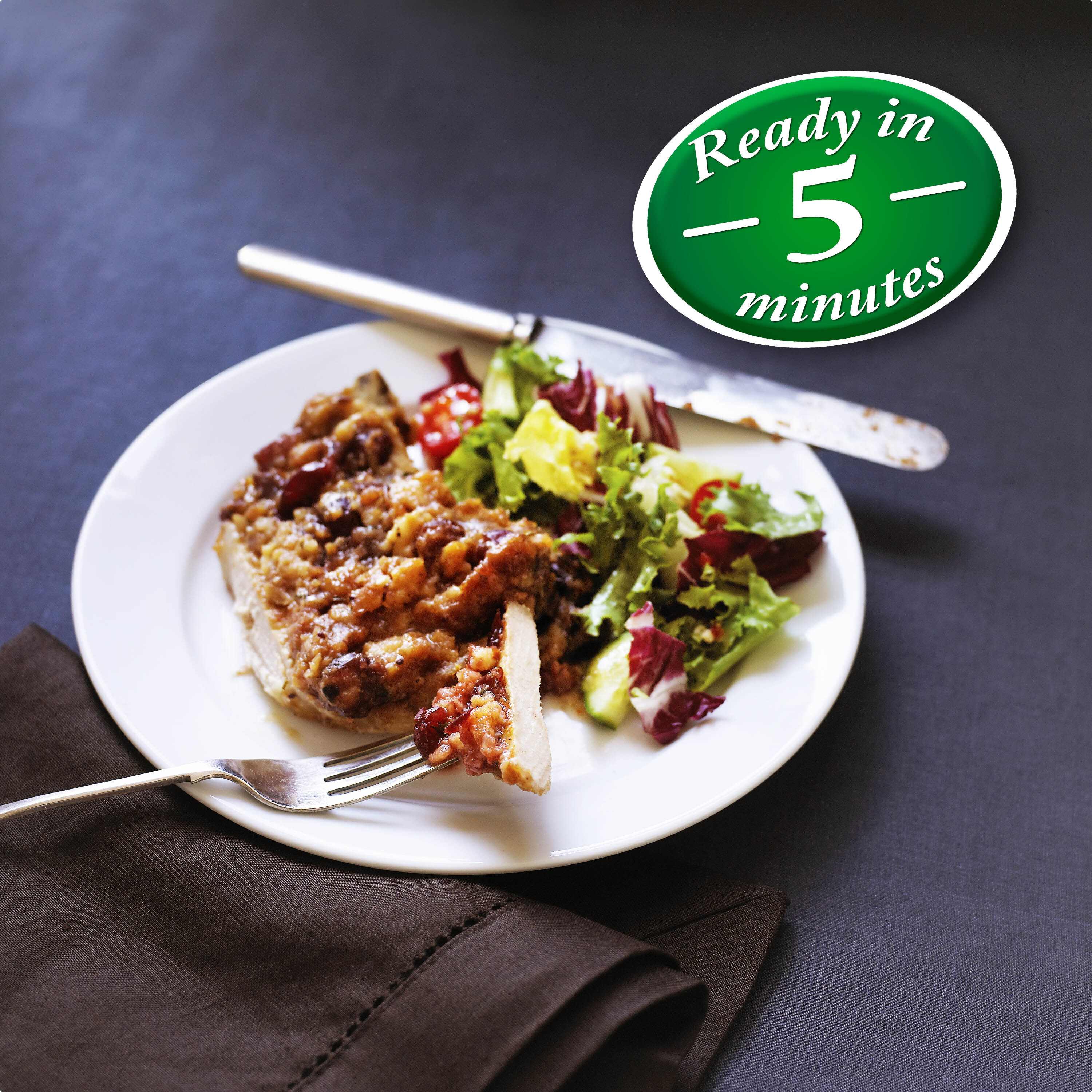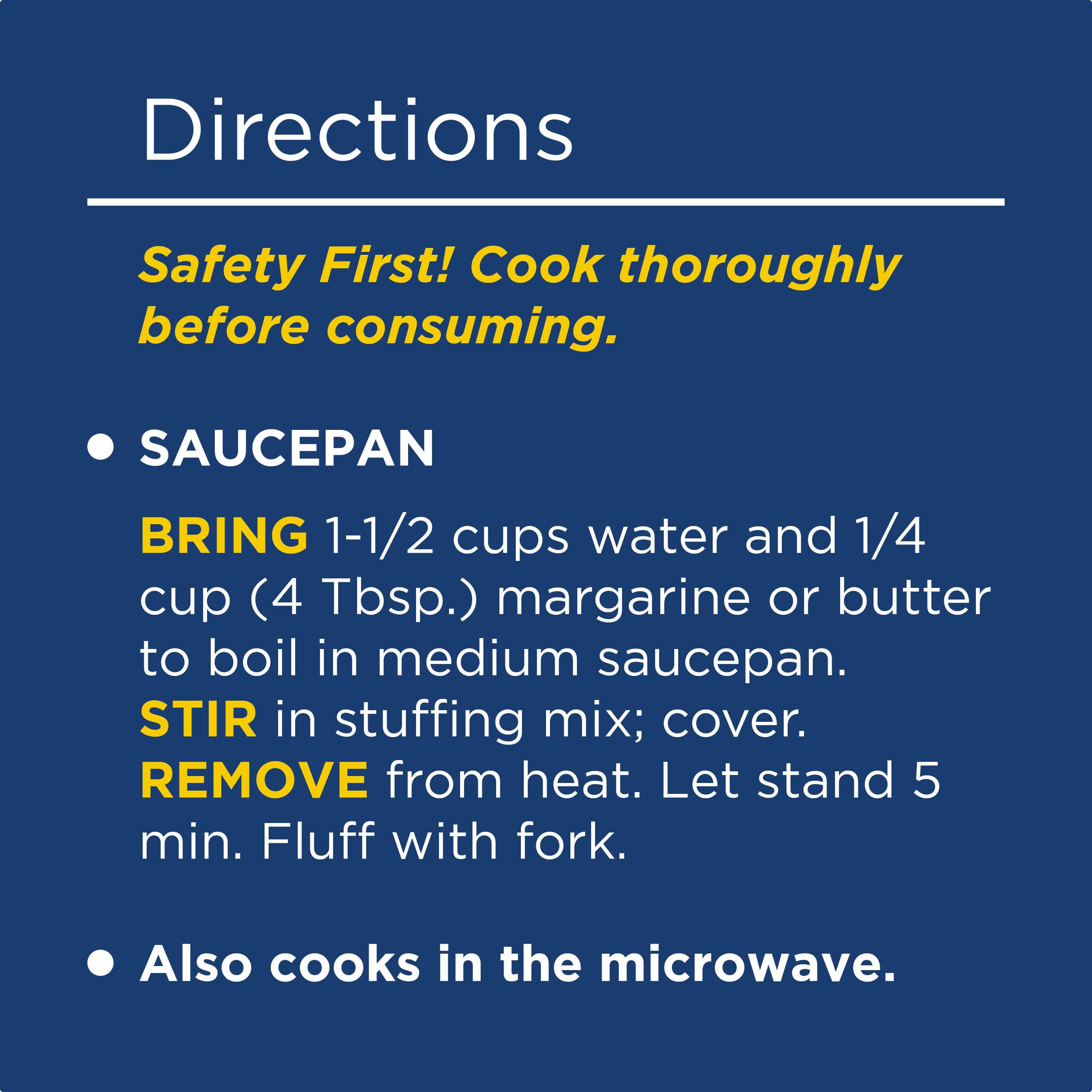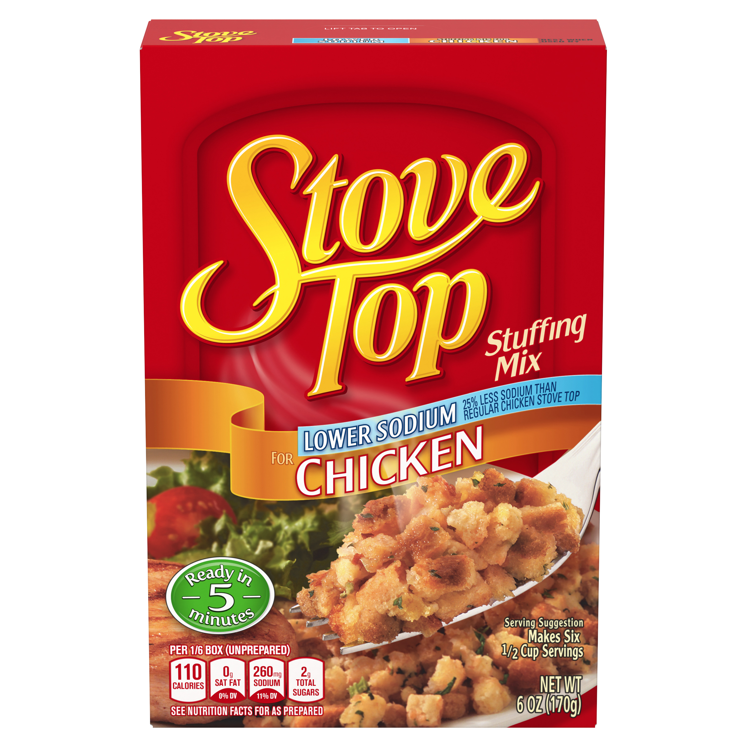 Make any family dinner something to celebrate with Kraft Stove Top Lower Sodium Chicken Stuffing Mix, featuring 25% less sodium than regular Stove Top Chicken Stuffing. A mix of fresh baked bread crumbs, herbs and real chicken broth brings you savory flavor and a soft, fluffy texture in every forkful. Each box comes packed with a dry, pre-seasoned stuffing mix. Simply add water and butter or margarine for a stuffing that tastes like it was made from scratch! Can easily be made in the microwave as well. Enjoy it as is, use it to stuff a chicken, or use it to build home-cooked meals such as Easy Pleasing Meatloaf or chicken stuffing casserole. Each 6 ounce box of this easy stuffing makes six servings and can be enjoyed stuffed in your Thanksgiving turkey or as an addition to any meal year round.