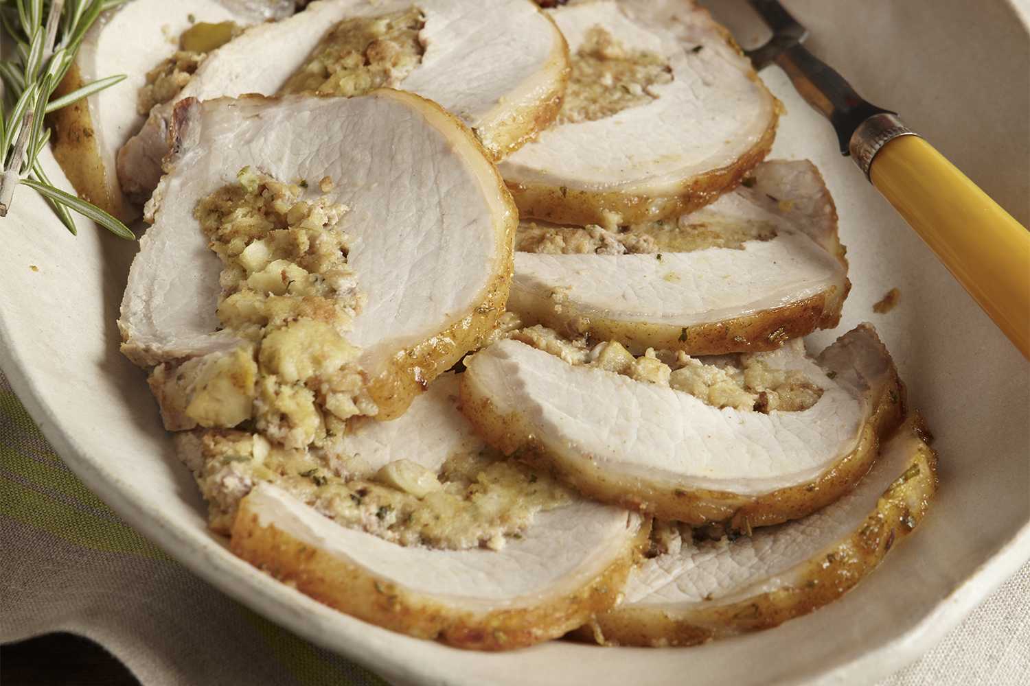 Spoon stuffing mixture onto cut-side of meat to within 1/2 inch of edge. Roll up, jelly roll fashion, starting at one short end. Place seam side down, in roasting pan sprayed with cooking spray.