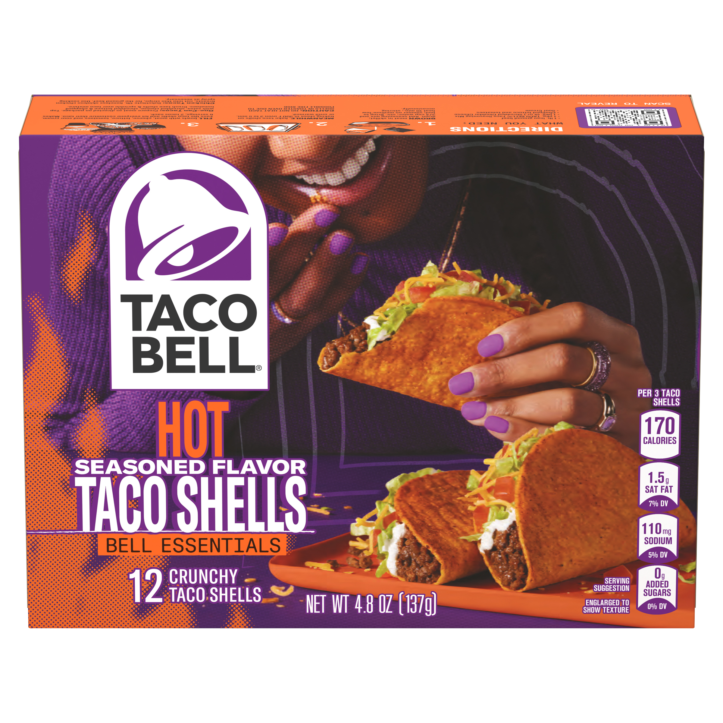 Live más at home with our Taco Bell Hot Seasoned Flavor Crunchy Taco Shells. Taco Bell makes mealtime more craveable with our crunchy taco shells made with yellow corn flour and coated with a mouthwatering spice blend inspired by the craveable Taco Bell Hot sauce packets. Add your favorite protein cooked with Taco Bell's signature seasonings to our hot flavored shells, then customize your taco with your favorite toppings like lettuce, tomato, cheese, sour cream and salsa. To prepare, place taco shells on a baking sheet and bake at 300°F for 3-5 minutes or until warmed. You can also crush the taco shells and sprinkle them over your favorite Mexican dish. Each 4.8-ounce box contains 12 taco shells. Live more fervently, more authentically, more joyfully with Taco Bell.