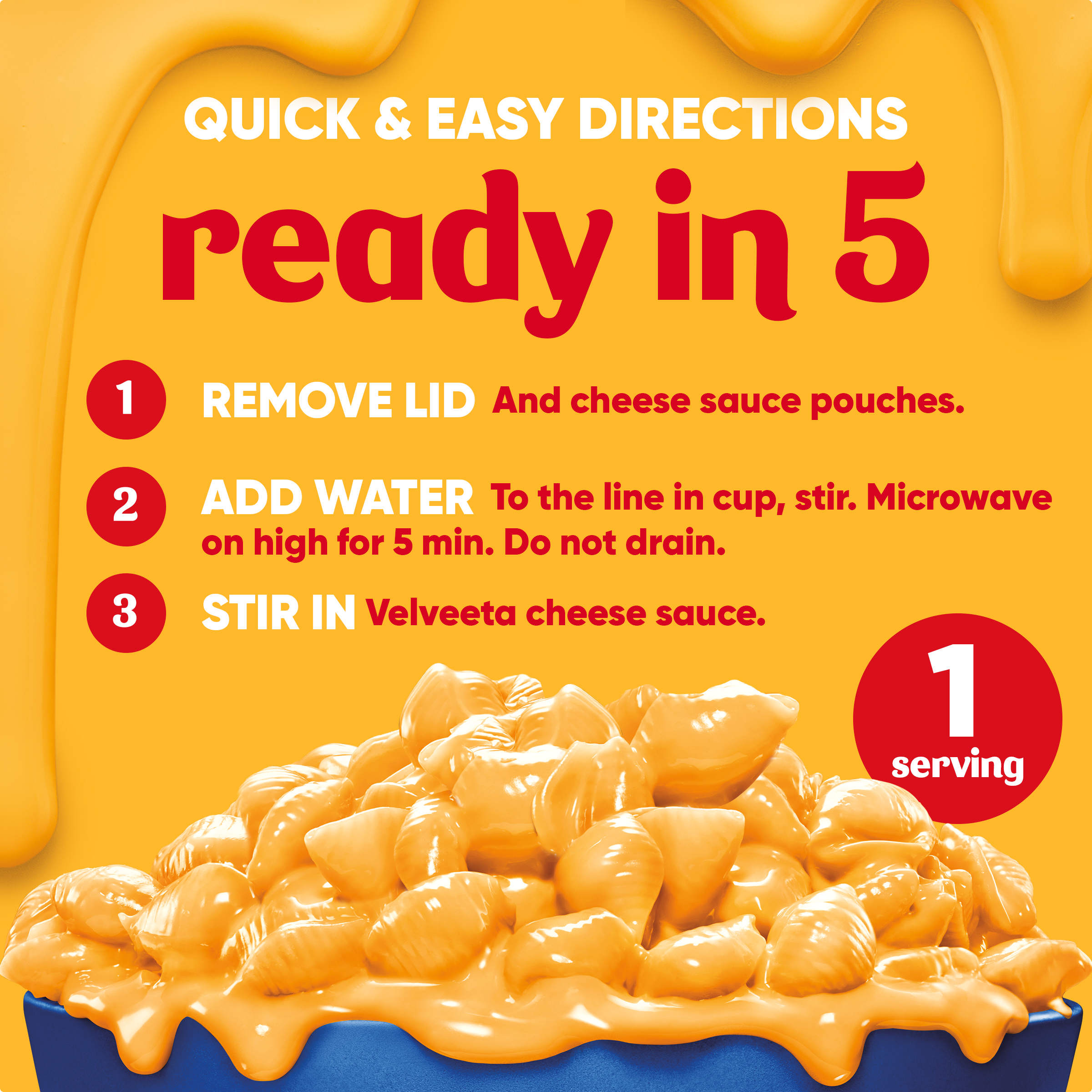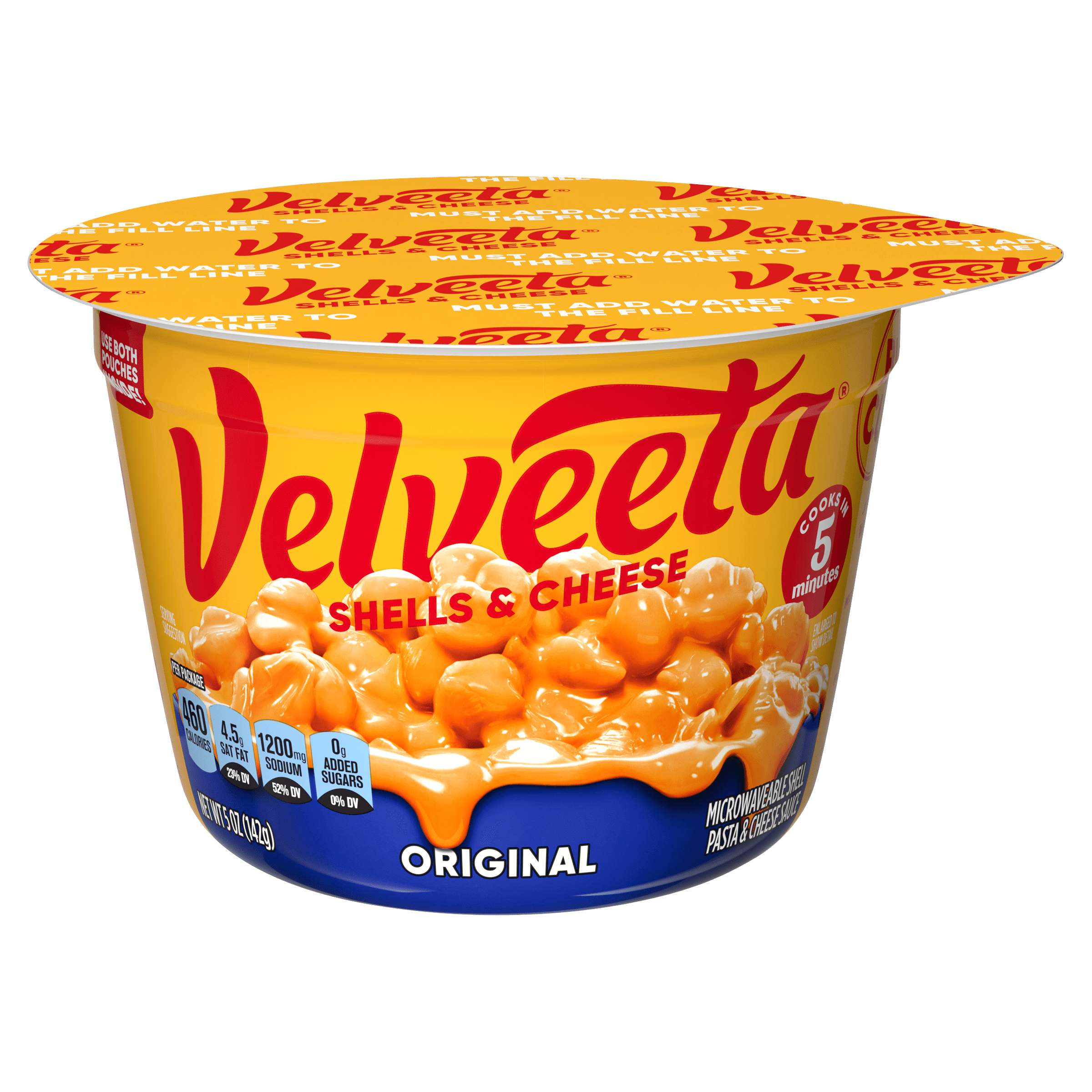 Shell yeah! Live life to the creamiest with Velveeta Shells & Cheese Original Microwaveable Pasta Cup. When your drip is as smooth as ours, you don’t waste time when it comes to delicious indulgence. For instant cheesy gratification, our original recipe hits the mark, with iconic, velvety meltability and tender pasta shells that grip the drip like no other. Velveeta’s supremely creamy texture and rich, savory taste satisfy your cravings any day of the week. Amp things up by customizing our cheesy pasta with added veggies, meat, toppings or seasonings. Sometimes unnecessary is necessary, so kick back, relax and embrace the flavor, whether it’s in the form of a snack, side dish or entree. Luxuriously convenient, preparing single-serve Velveeta Shells and Cheese cup is a breeze. Simply remove lid and sauce pouch, add water up to the fill line, microwave uncovered for 3-1/2 minutes, stir in the liquid gold cheese sauce and enjoy, unapologetically. Each box contains four 2.39 oz cups. That’s La Dolce Velveeta!