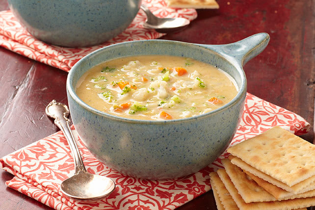 Enjoy this cheesy vegetable soup that's as easy as it is velvety. This vegetable soup uses prepared broth, a package of frozen veggies, & cubed VELVEETA.