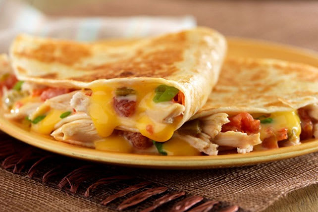 Heat large heavy nonstick skillet on medium heat. Spoon about 1/2 cup chicken mixture onto half of 1 tortilla; fold in half. Add to skillet; cook 1 min. on each side or until quesadilla is golden brown on both sides. Remove quesadilla from skillet. Repeat with remaining tortillas and filling.