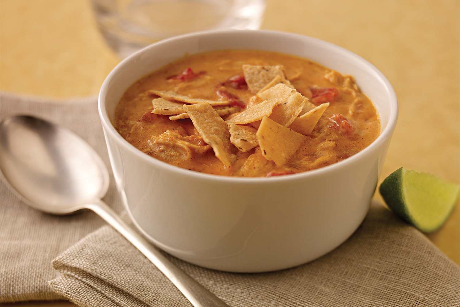 Try our Cheesy Tortilla Soup as an alternative to traditional chicken soups. The spice of Cheesy Tortilla Soup is topped with crunchy tortilla chip bits.
