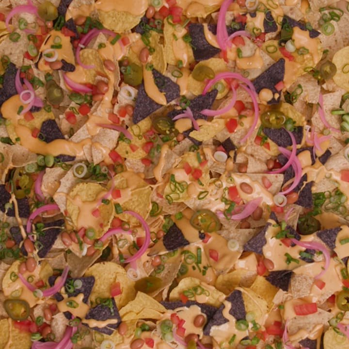 Serve immediately by drizzling over chips, while reserving some to have on the side for dipping. Garnish with the pinto beans, sliced pickled jalapenos, pickled red onions, diced roma tomatoes and scallions.